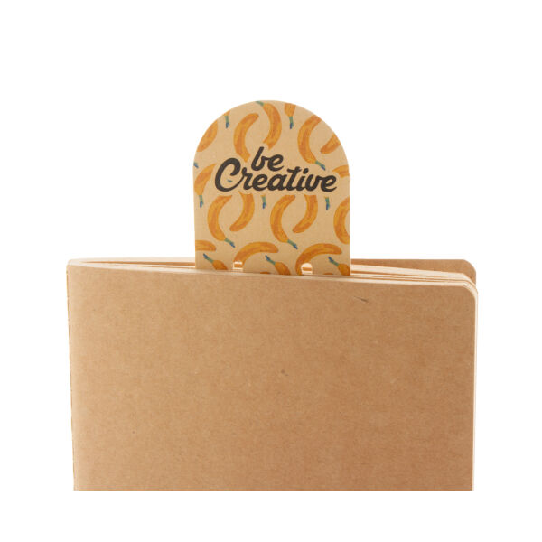 Custom made boekenlegger van gerecycled kraftpapier met memoblaadjes. Bevat 25 vellen gerecycled papier met sticky notes (50×75 mm). Prijs is inclusief full colour bedrukking op voorzijde. MOQ: 100 stuks.