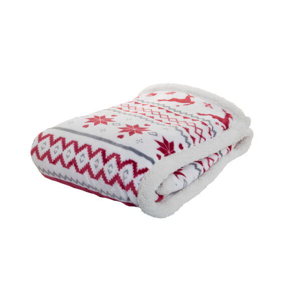 Dubbellaagse RPET Kerst deken met 230 g/m² RPET flanellen fleece en omkeerbare 210 g/m² RPET sherpa fleece voering. Verpakt met lint en bedrukbare papieren kaart.