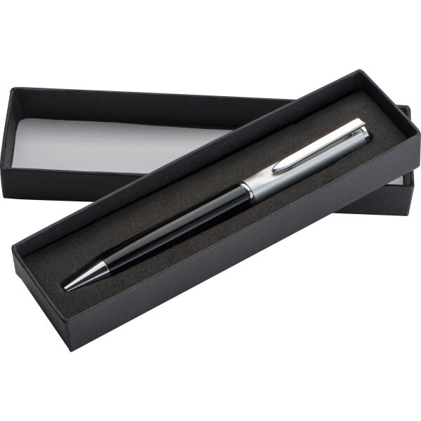 Mooie luxe balpen in een fraaie kartonnen geschenkverpakking. Blauw schrijvende grote vulling. Uw reclame graveren wij rechts naast de clip.