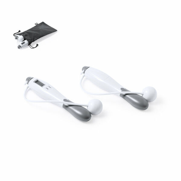Digitaal springtouw, vervaardigd uit resistent ABS. Met ergonomische handgrepen en LCD display met insteltoetsen. Gepresenteerd in RPET polyester etui met trekkoordsluiting, gemaakt van gerecycled plastic om het hergebruik van plastic afval te bevorderen en bij te dragen aan de duurzaamheid van de planeet. Opvallend RPET-label op het etui. Werkt op batterijen (knoopcelbatterijen inbegrepen).
