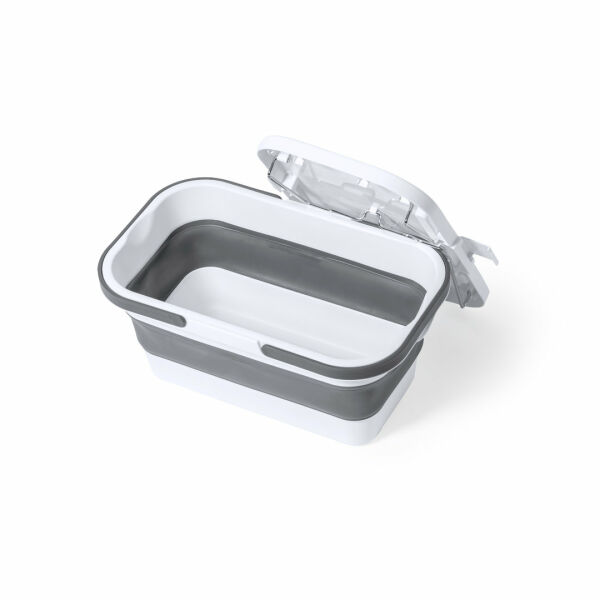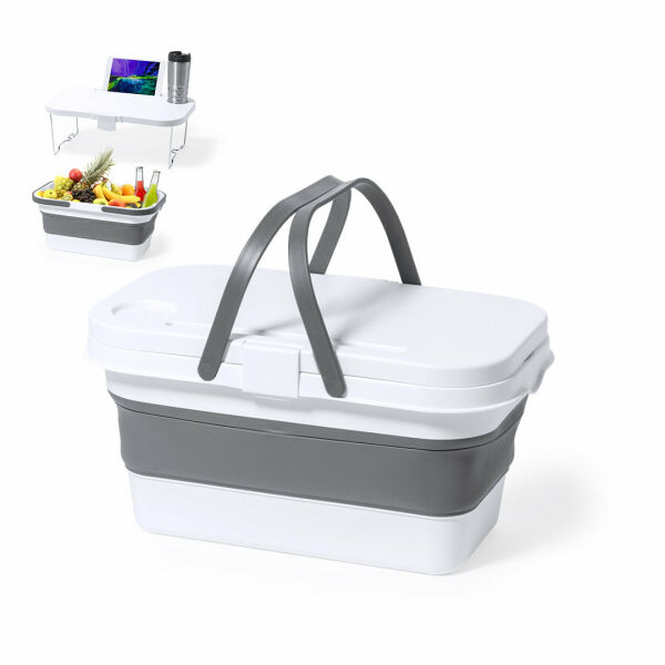 Opvouwbare, multifunctionele picknickkoelmand. Gemaakt van resistent PP-materiaal in witte afwerking, met een inhoud van 16 liter. Deksel om te bouwen tot tafel door middel van 2 inklapbare poten, met ingebouwde houders voor smartphone/tablet en bidon. Inclusief 2 inklapbare handgrepen in grijs. Klein formaat wanneer opgevouwen, ideaal om gemakkelijk op te bergen.