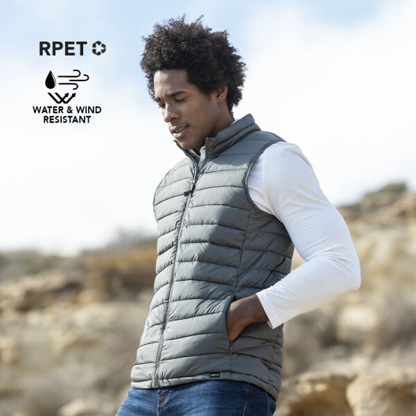 Unisex vest van warm en zacht materiaal 100% polyester RPET, gemaakt van gerecycled plastic om het hergebruik van plastic afval aan te moedigen en bij te dragen aan de duurzaamheid van de planeet. Van extra licht materiaal met veereffect, waterdicht en winddicht, met binnenvoering. Rits in de nek met klep en treklus, grote zijzakken met rits. RPET-label en verkrijgbaar in een brede waaier van kleuren. Maten S, M, L, XL, XXL.